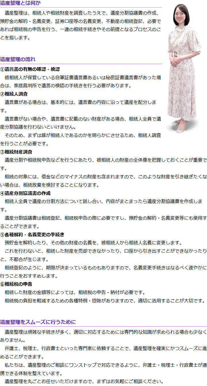 遺産整理は、こちらにも書かれているとおり、遺言書の確認から相続税の申告までの一連の手続きのことを指します。